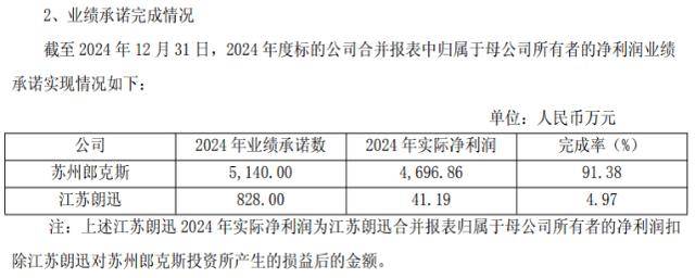 然而从实际完成度看,2024年,苏州郎克斯和江苏朗迅的实际净利润分别为4696.86万元和41.19万元,对应的完成率为91.38%和4.97%,未完成首年的业绩承诺。公司彼时解释称,受新项目前期产品成本较高、毛利率较低等影响,苏州郎克斯该年盈利不及预期;而江苏朗迅由于部分已出货订单未满足收入确认条件等原因导致其收入未达预期。
